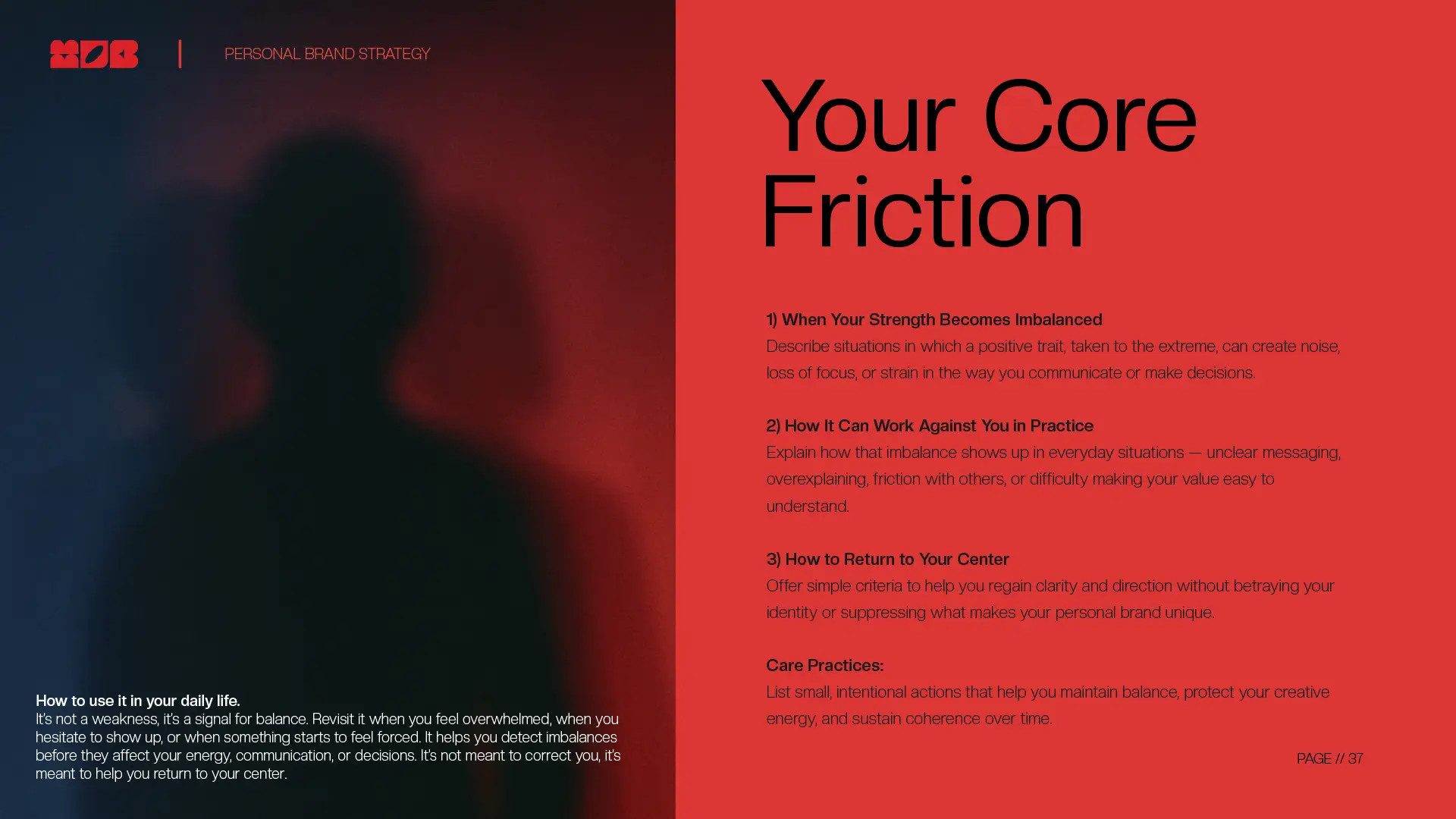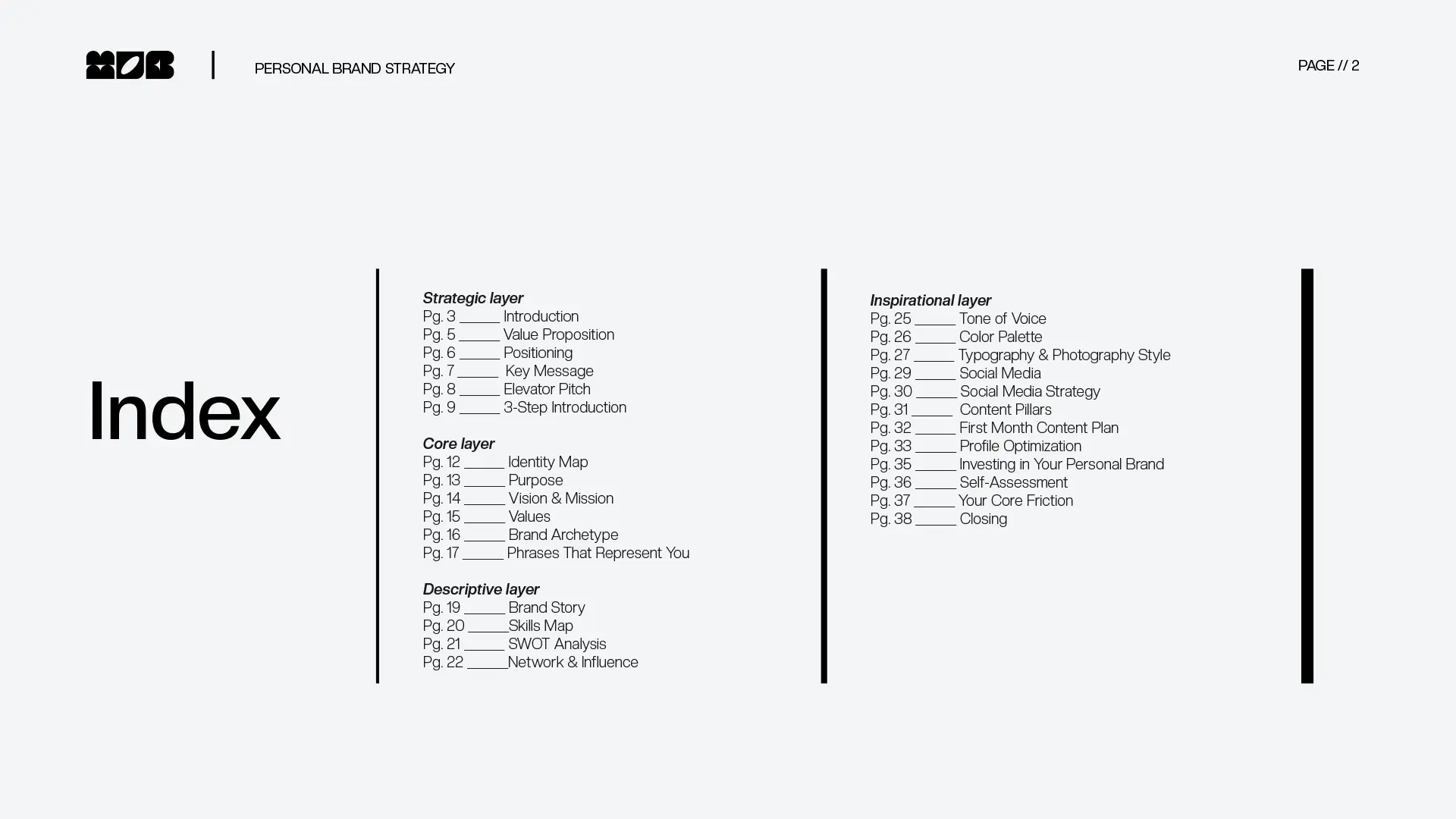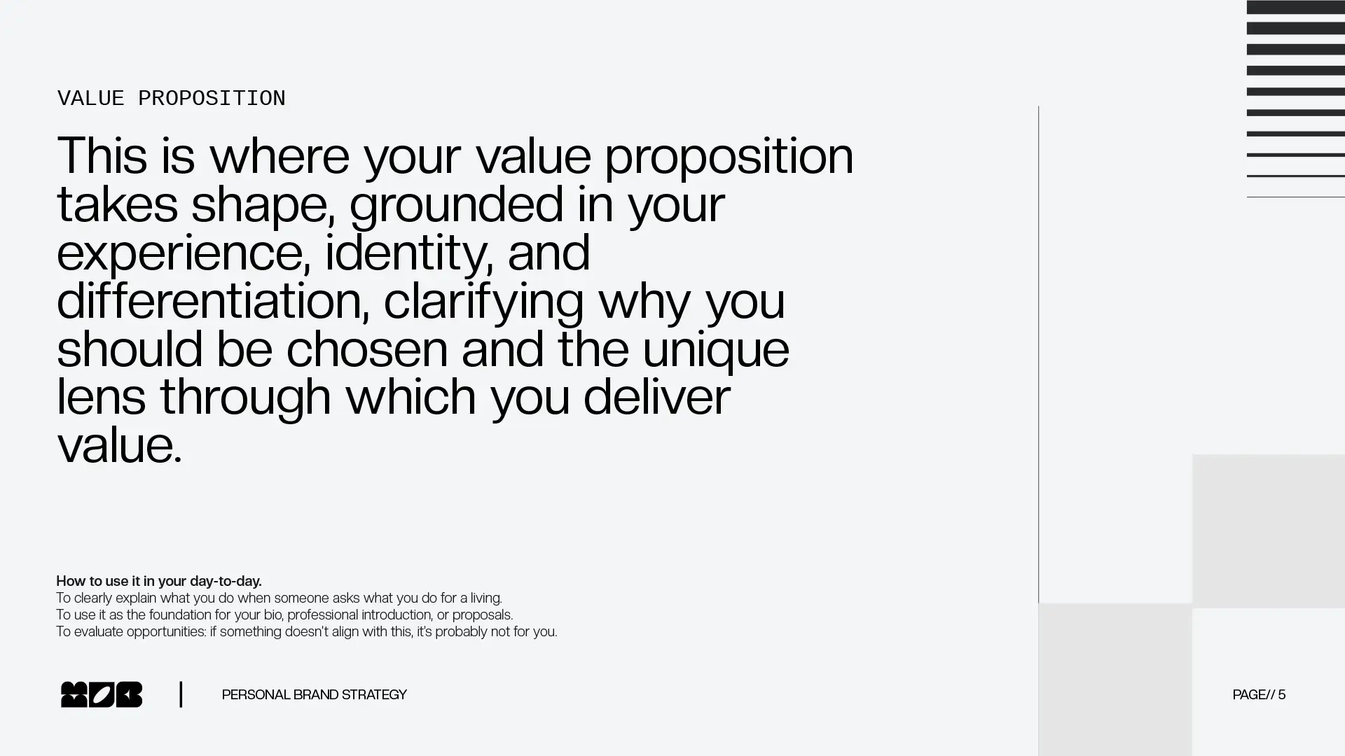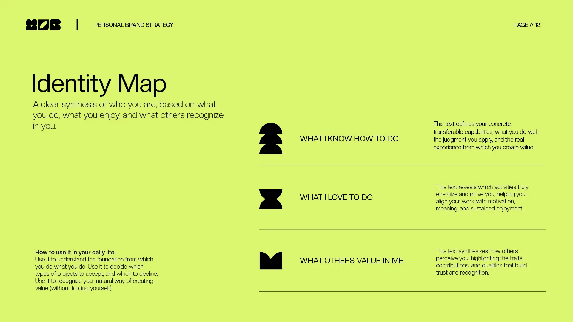 Based on the information you provide, MOB turns your insights into a clear personal brand strategy that helps you define, position, and communicate your value with confidence.In under 60 minutes, you receive a structured, actionable roadmap designed to help you move forward with clarity, not guesswork.