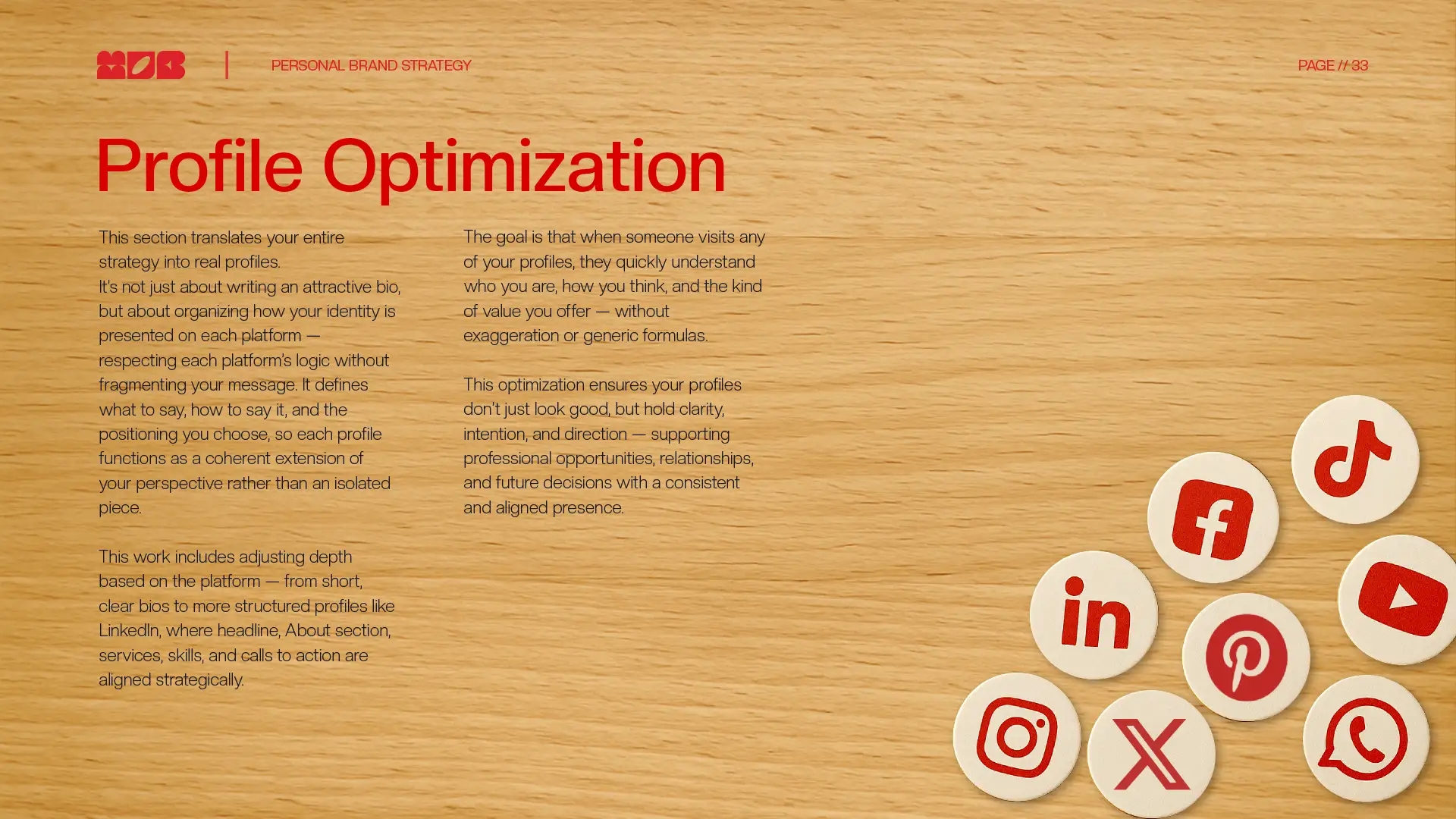 Beyond the strategy framework, you receive a practical guide to align your social profiles, resume, interviews, and presentations under one clear message.